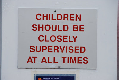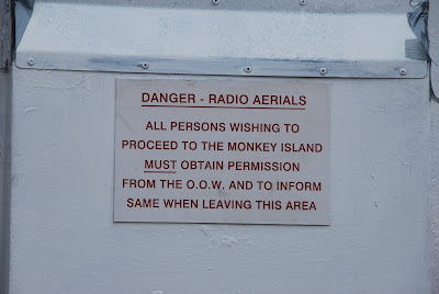 the best way to reach glasgow was on a ferry, where i saw this rather humorous sign. i love the phrase "monkey island." i didn't try to go there. didn't really see the officer of the watch, or i might have asked.