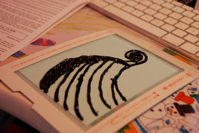 since i live in denmark, i had to do a viking ship, tho' the one i modeled it on is in norway. i figured that was ok since i actually work in norway. and who knows, maybe we'll move there soon?! here's the inked screen. there's just something about that glistening ink that makes me happy!
