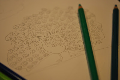 15.  i've been drawing quite a bit of late...here's a peacock i did and might still color in...but i'm counting him because i like him as a pencil drawing as well and i think if i do a colorful one, i'll just draw it with the colored pencils from the beginning.