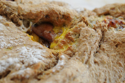 it's a kind of stuffed bread which i have made numerous times. it's jamie oliver-inspired. you make a basic bread recipe, then roll it into a long relatively thin line of dough and load it with all kinds of delicious things...bacon, eggs, herbs, cheese, pesto--whatever you have around and which sounds good to you. then you close it up and usually it becomes a ring. on this occasion, i had a new kind of flour and the dough went to pieces on me instead of staying together. resulting in this very ugly rather 8-shaped bread.