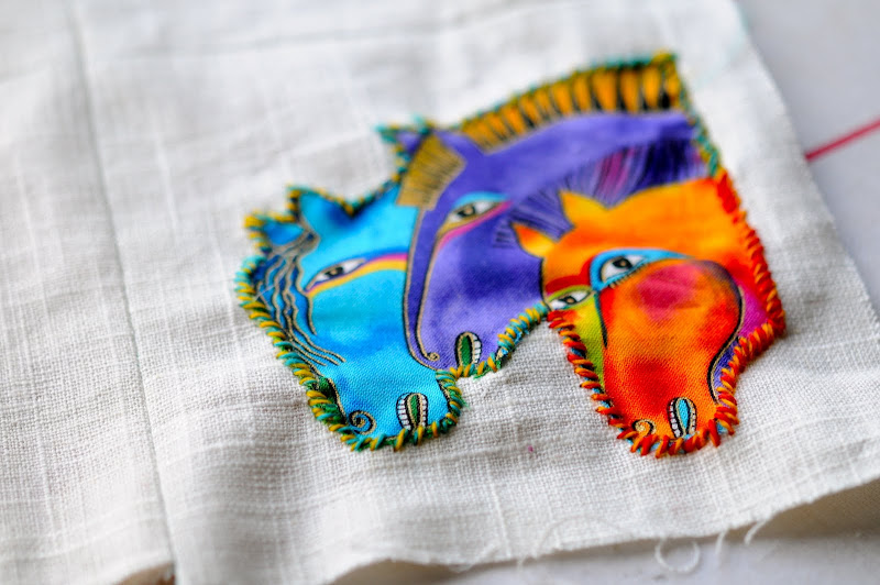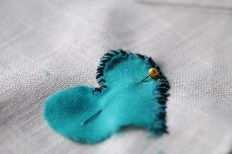 the one that felt right to begin with was a velvety turquoise heart, which i embroidered onto the linen with a beautiful yarn that moves through the colors of the rainbow, or at least the colors of my rainbow, which involve lots of shades of turquoise and green and eventually reds and oranges. as i began to sew it on, thinking of how the blue heart had something to do with love being the cornerstone of my world and it being blue symbolized husband, i realized that the black strand twisted with the blue also had some echo of husband in that it was both masculine and somehow reflected his salt and pepper hair (ok, i realize, i'm over-analyzing here and i promised i wouldn't, but as i was stitching, these were the thoughts that popped into my head and i wanted to record them).