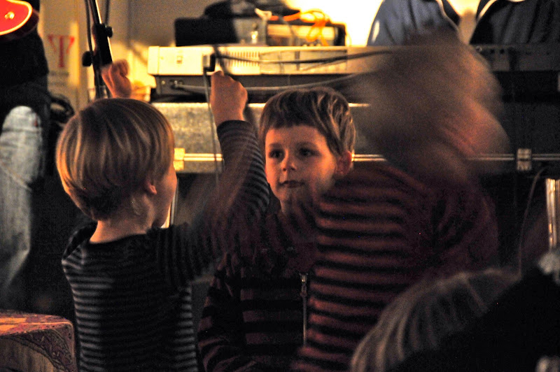 but the most delightful sight of all was of three little boys who stood up in the very front and danced their little hearts out with thorough enjoyment (the little blonde one is ulrik's other son). they were pretty far from me, across a dark room and in constant motion, so this is the best shot i was able to get, grainy as it is (3200 ISO). they absolutely loved the music.