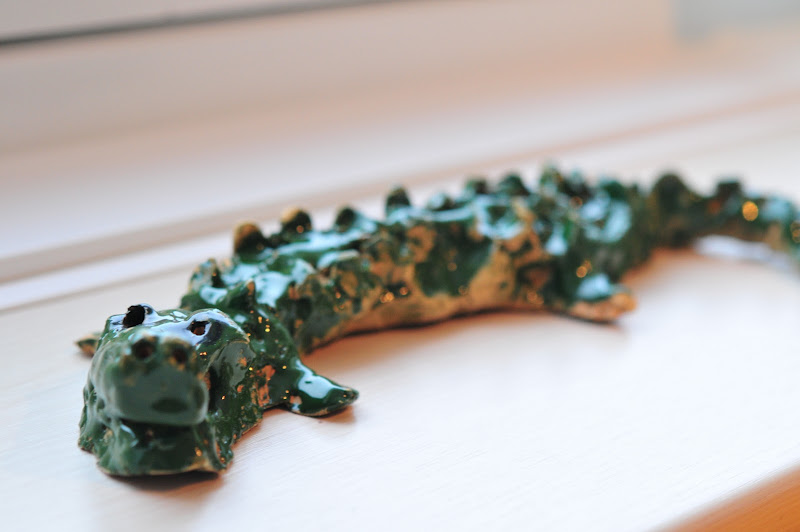 i had a really delightful evening, meeting her family and sitting up 'til the wee hours, drinking tea and chatting and looking at all of her beautiful art and the stones she's gathered and displayed around the house. her son has definitely caught her artistic bug and he made the most delightful little ceramic crocodile! he (the crocodile that is) tried to crawl into my camera bag when i left, but i made him stay there with his family.