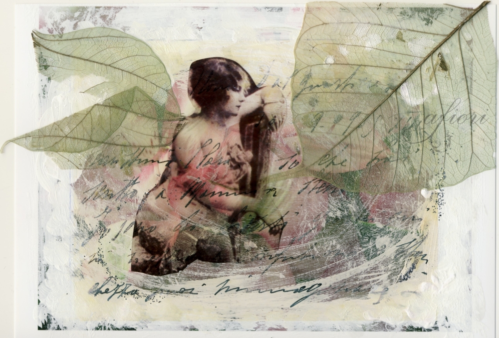 Why thank you! Well, photography is one thing and collage is another. I have always enjoyed working with my hands and with paper. To create this collage, Find Your Wings, I printed out a photograph I had taken of some pink flowers. I painted on the photograph using acrylics, scraped off the paint, printed out a vintage image as a transparency, hand coloured it a bit and stuck it to the paint, added real leaves, painted some more, scraped off paint and scanned it all in when it was finished. Many of my collages are from my own art journals and then I use them as covers for the journals I sell.