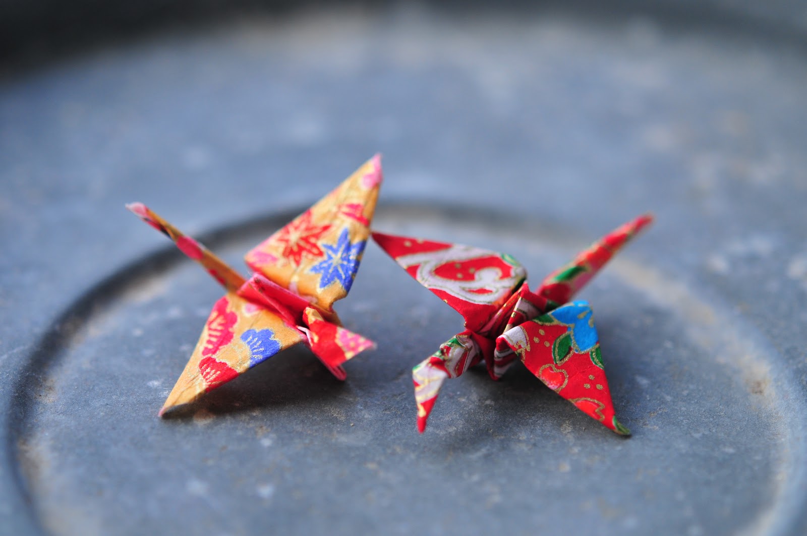 so after watching 4 different videos on youtube (i'm a little slow) and downloading a PDF (which i couldn't relate to at all), i managed to make these two tiny paper cranes. however, i got stuck trying to make a third one. it's kinda like me and granny squares...my mind goes blank on it, like it's never done one.