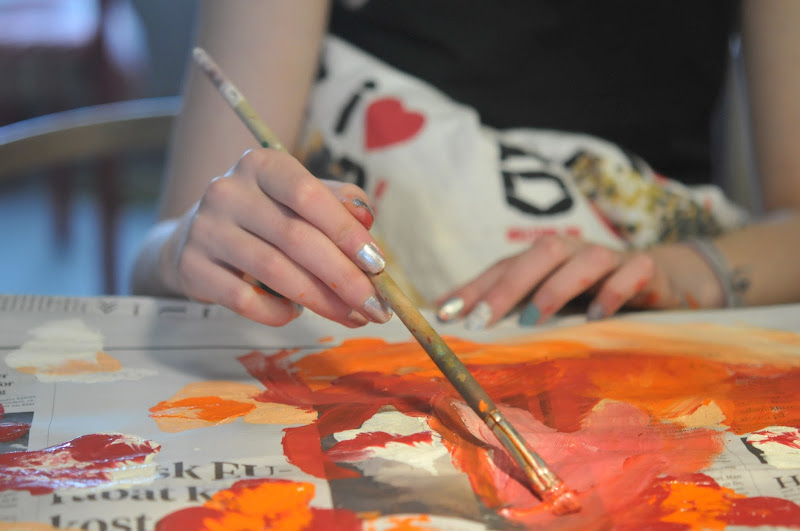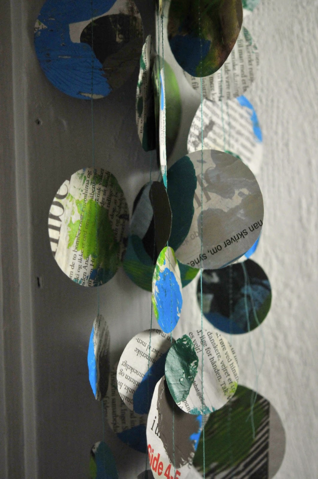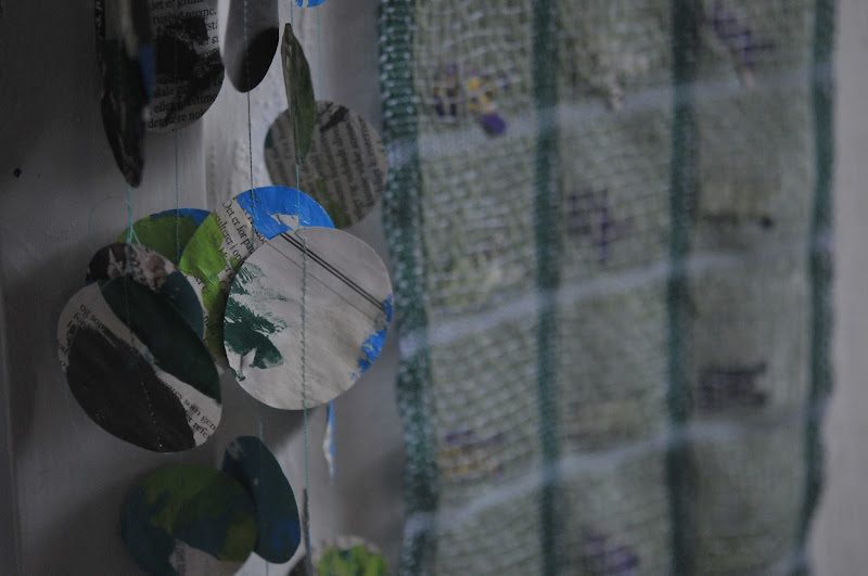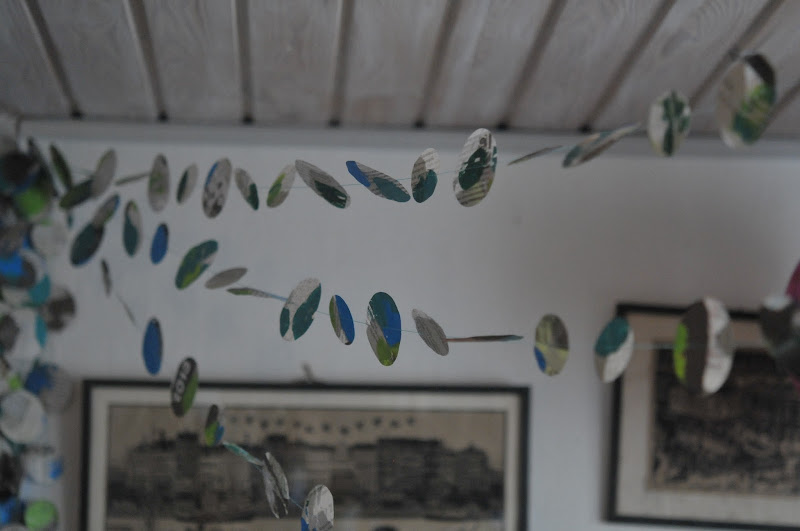 coming up for air after a week of being sick, i wanted to make something. i was inspired by jessica's ten days of garlands and a big stack of newspapers that were accumulating in the big round basket. we've always got paint around and plenty of thread, so sabin and i painted up some newspaper and punched out circles and i sewed and sewed. my garland is a little long (like about 20 meters) and a bit tangled, as molly "helped" me hang it up above my desk. but it's cheery and makes me happy. with the blues and greens i used, some of the circles have a decidedly globe-like quality, which also makes me happy. this photo of sabin painting her newspaper in fiery orange and red, you guessed it...makes me happy.
