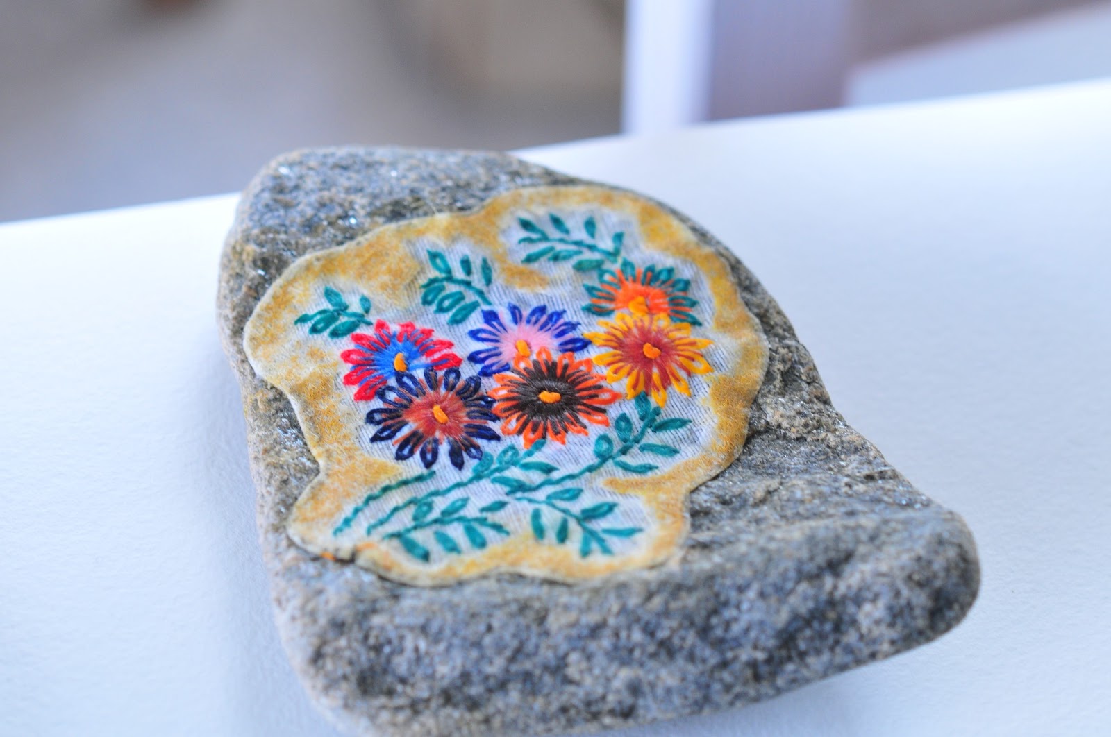 another technique we learned was how to set embroideries onto a stone or piece of driftwood. i took a piece of embroidery from a second-hand shop to use for my attempt. you trace around it and then cut out the shape in a piece of fiberglass wallpaper. you then glue the embroidery onto the fiberglass wallpaper and press it in a book to dry. after that, you take colored pencils and draw around the edge. you can either choose to match the piece of wood or stone you're setting it on, or use a contrasting color. i chose contrast.