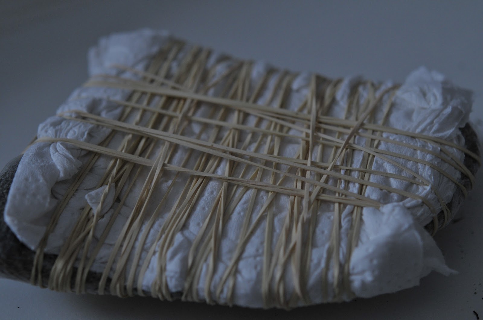 then, you glue it well, press it onto the stone or driftwood and wrap it in plastic film and then paper towels and then put on a bunch of rubberbands to hold it in place. we let it dry overnight. my fellow students used driftwood and theirs were dry by the next day. mine, which was set on a stone, was still pretty wet, since the stone didn't help by absorbing any of the moisture.