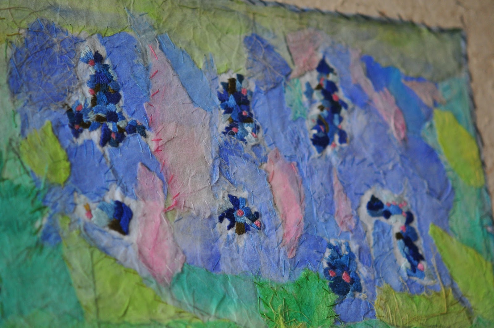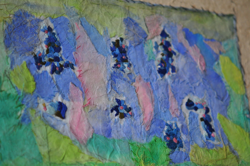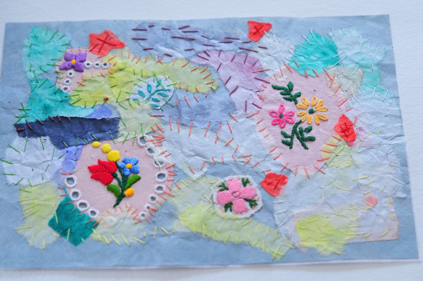 another of the techniques we learned at anne brodersen's wonderful weekend course involved small embroideries and bits of torn handmade paper that we painted with watercolors. we tore up a 5x7 piece of rice paper and assembled the little bits on a sheet of scrap paper.