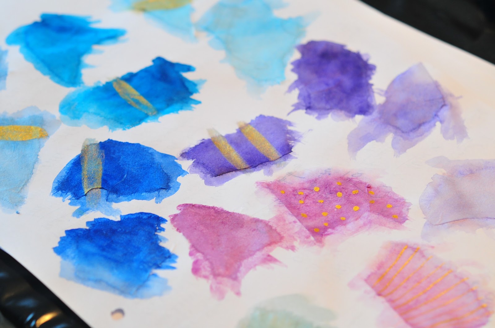 then we painted them with watercolors, in colors we thought either matched our small embroideries or (if you were me) colors we liked. i had no idea what my embroideries would look like, as i had to rush home and make some that evening while watching downton abbey (episode 2, season 3, so shh on what's going to happen).