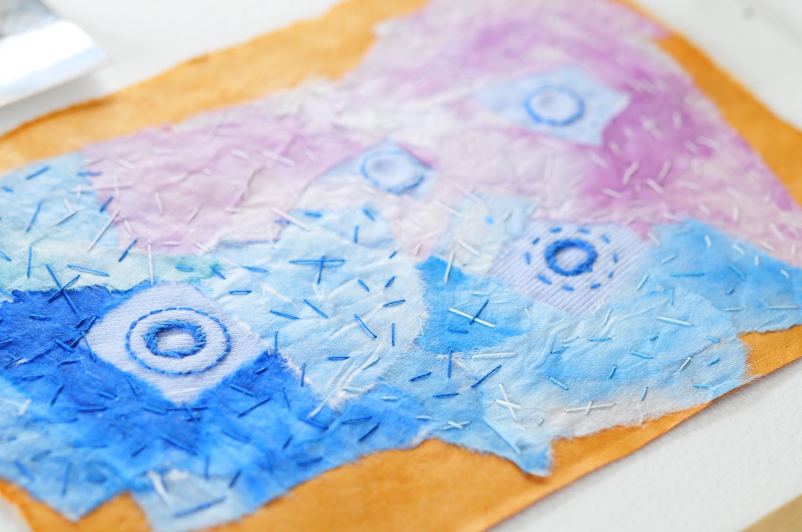 tho' anne recommended using a fine thread, i chose this variegated thread that was a bit thicker because the colors were perfect with the colors that i had painted on my bits of paper.