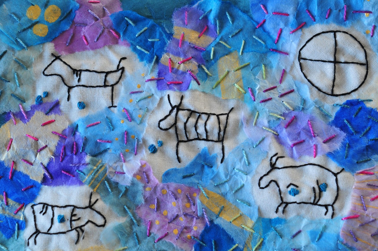 the next day, our little bits of tissue-like paper were dry and we could begin to assemble them into a collage. i stitched up some small fantasy animals based on helleristning (it was either that or feathers).