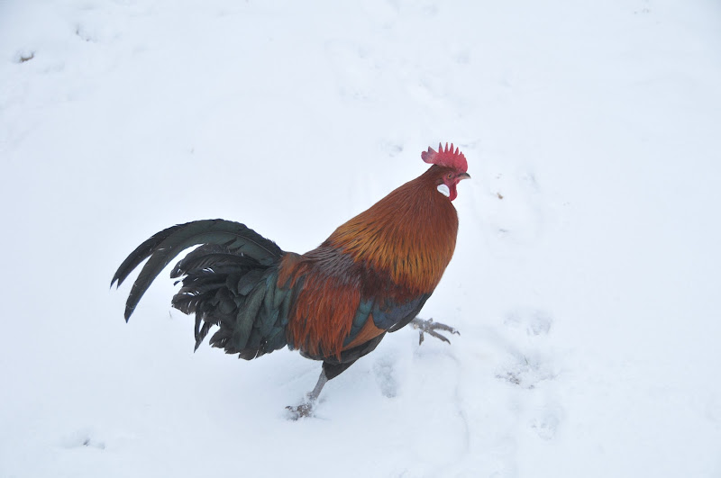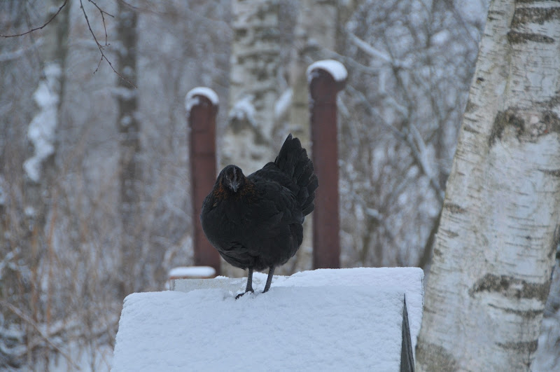 this little hen is taking a break from sitting on her nest of 16 eggs to bathe in the fresh, clean snow and survey the world.
