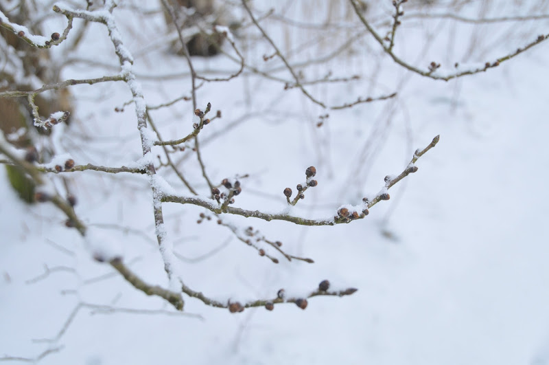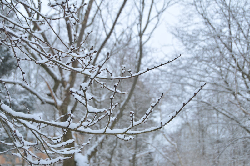 the fruit bushes and the garden may be covered with snow right now, but it's fleeting and it won't be long before the bushes burst forth with leaves and blossoms and we begin to work in the garden. the green hope hangs in the very air, still, breathless, waiting quietly beneath the snow, secure that its moment is coming.