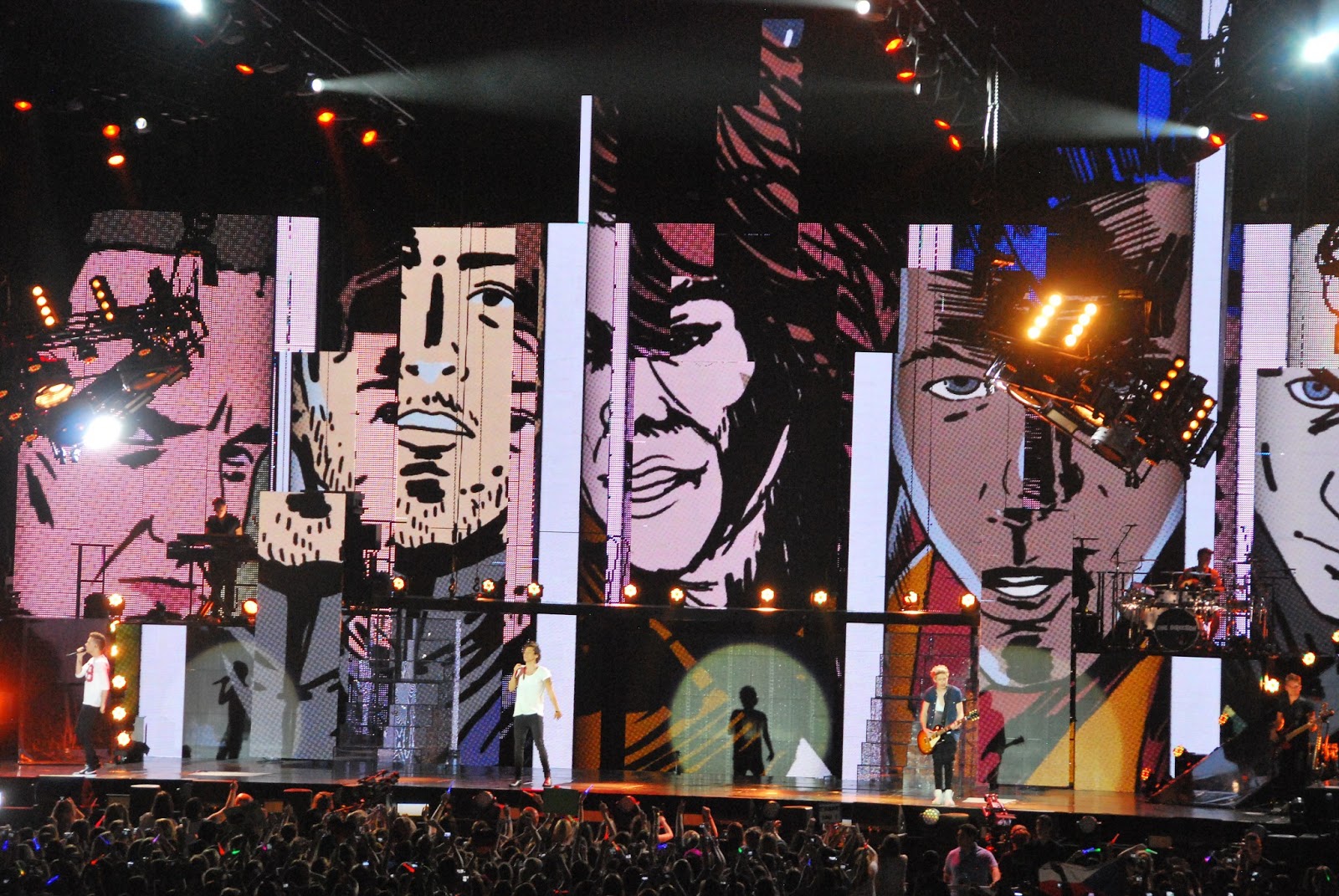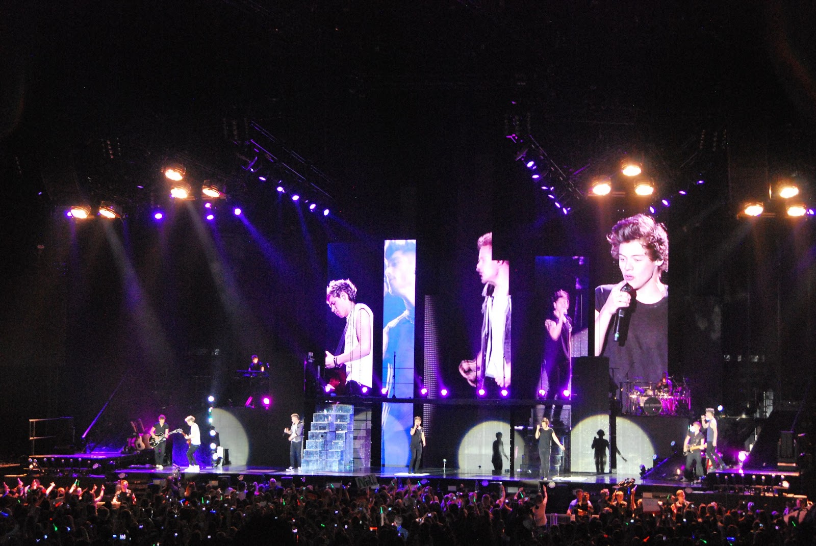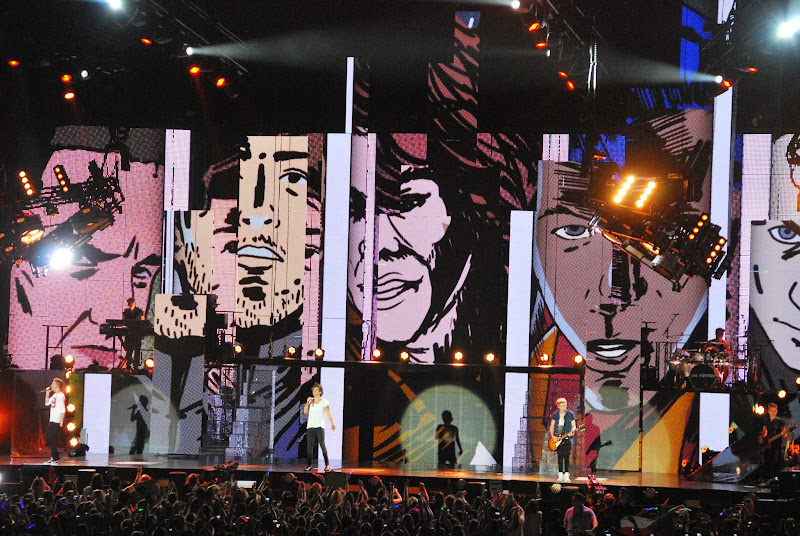 as for the concert itself, 16000 screaming girls and a handful of dads and moms made up the audience. it was a cheerful, happy group. the boys are cute, well-mannered and not lip synching. they're humble and sweet. it made me totally ok with my child being so into them that her room is plastered on every wall with posters (and with driving 6 hours to see them). they can really perform and the production values of the entire show were high.