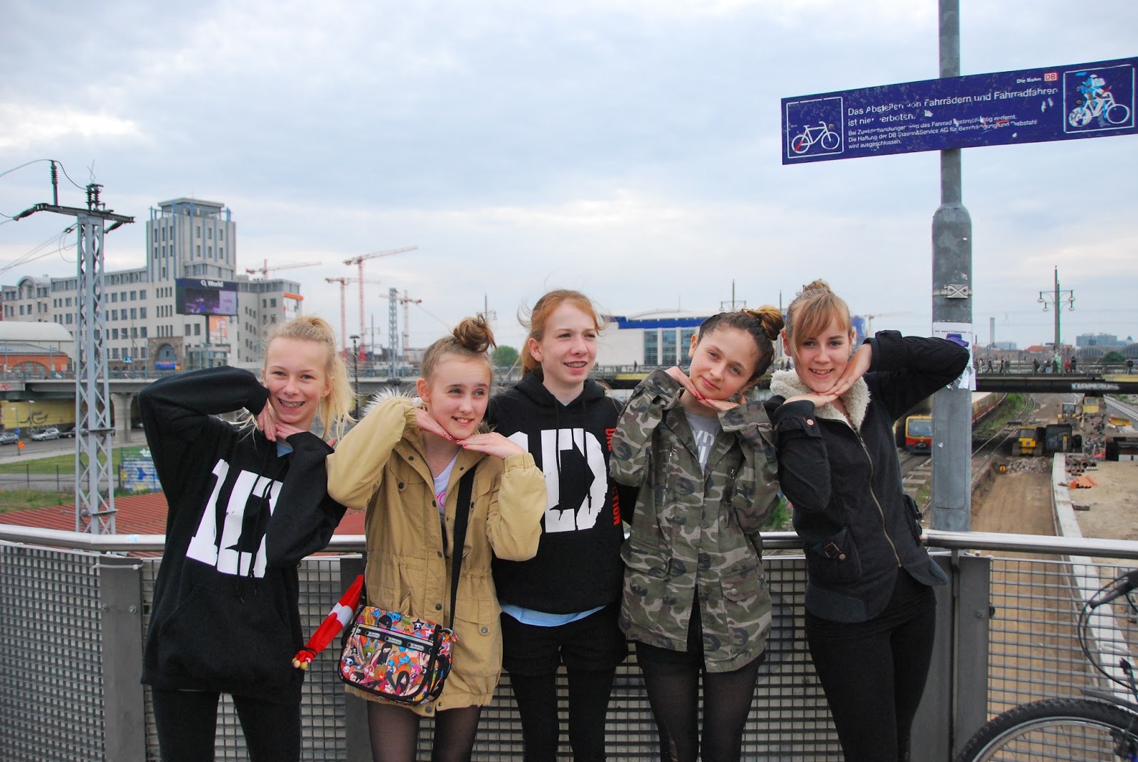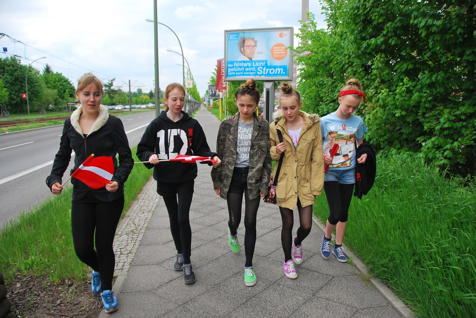 we set out for berlin on saturday morning, bound for a concert with british boy band One Direction (hereafter 1D). we found a hotel that could accomodate 7 in one room (it was actually two rooms with only one door), checked in, got all ready and set out for the concert. as you can see, it was essential to already be wearing 1D gear upon departure. my favorite part of this photo is the mad scientist political ad in the background (more about those in another post).