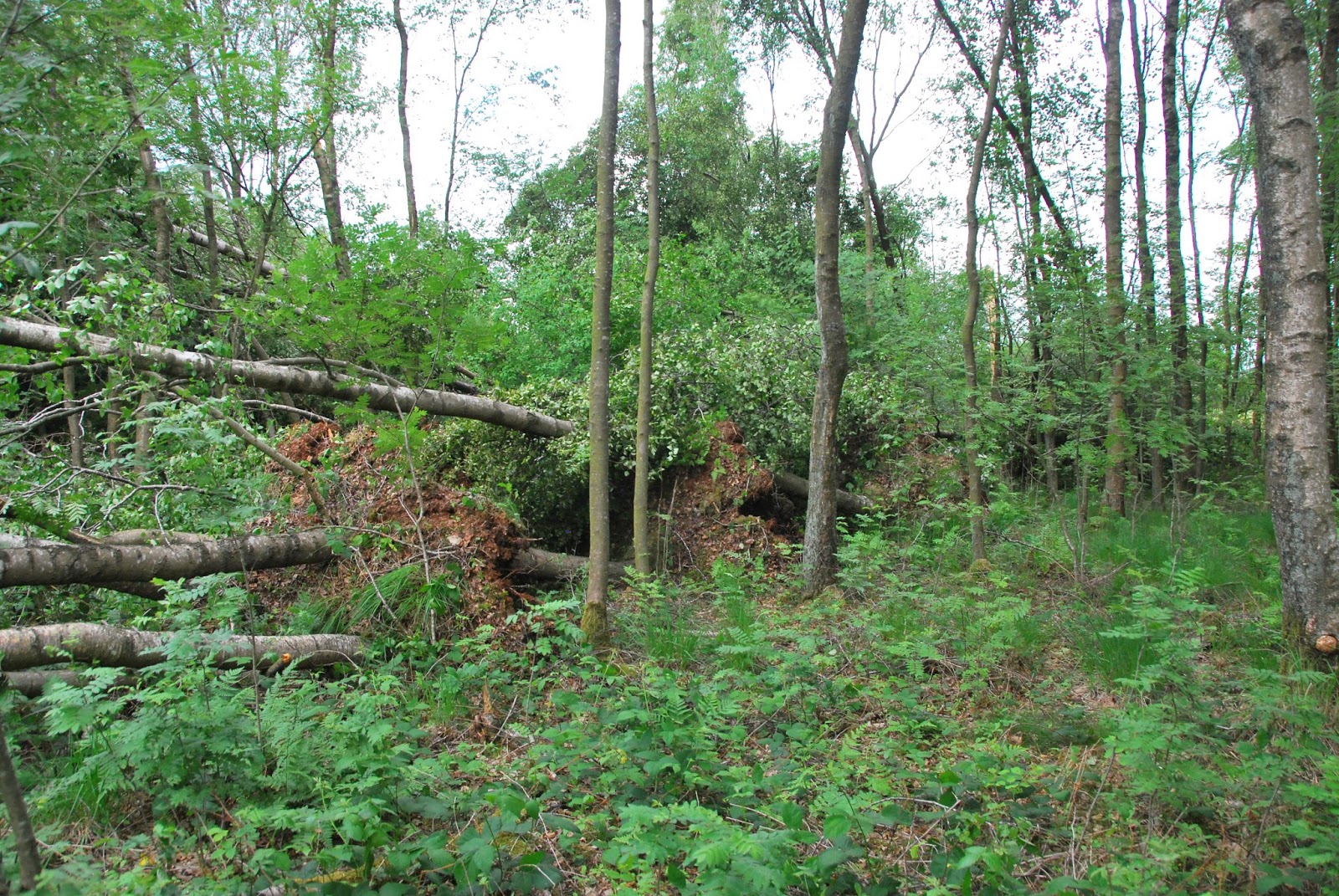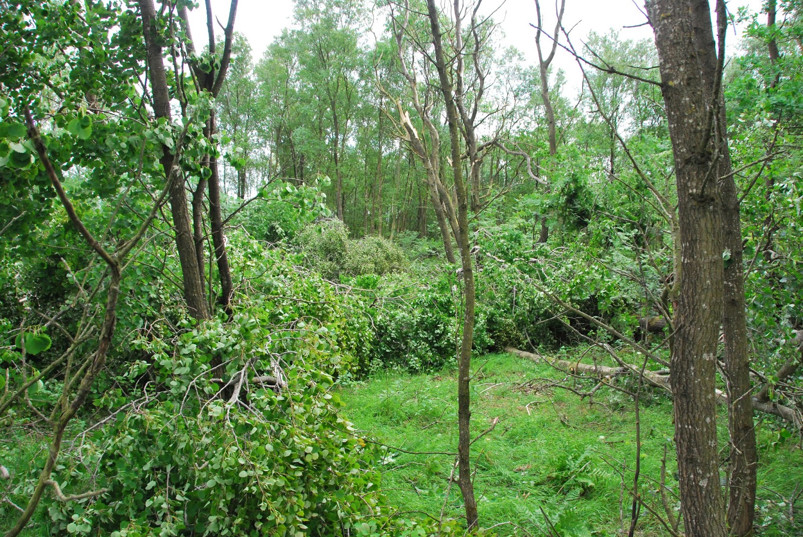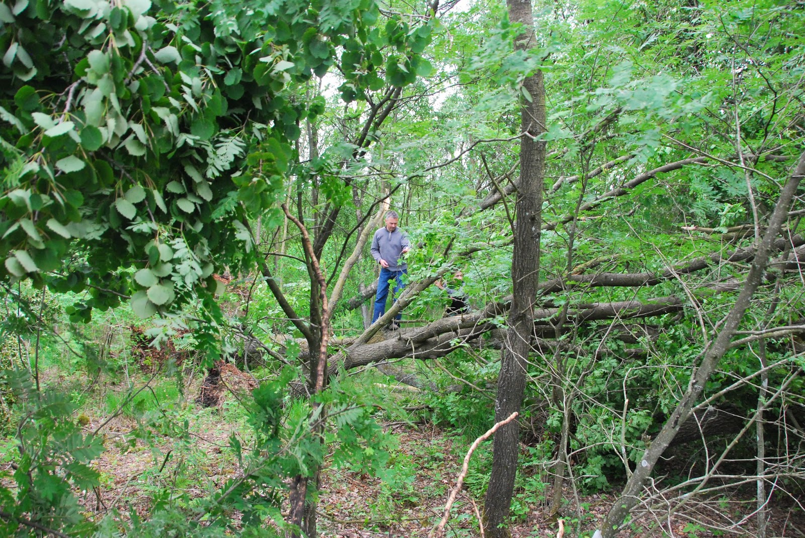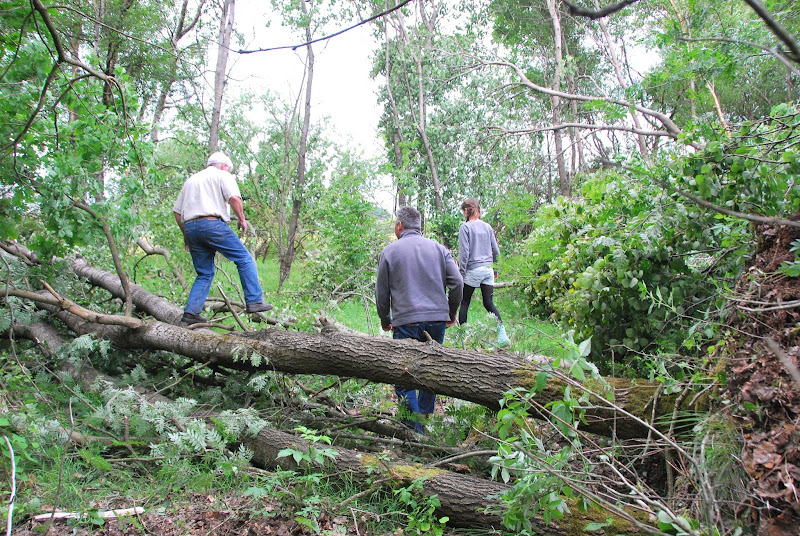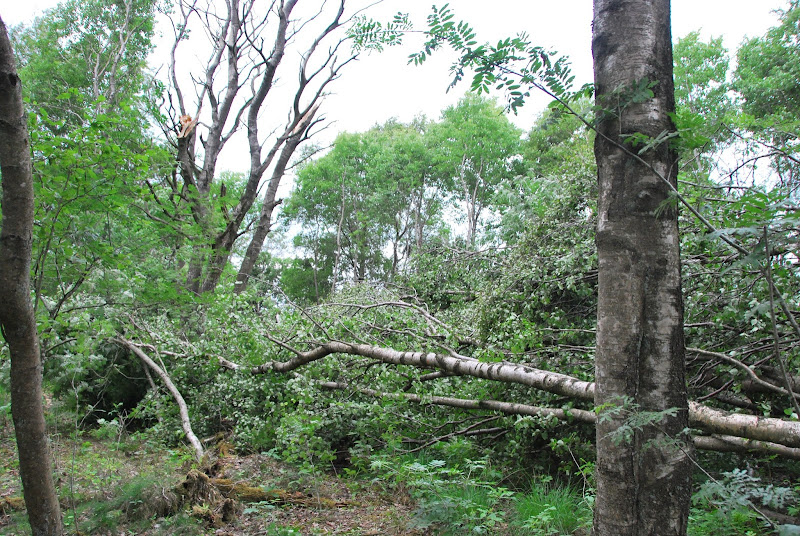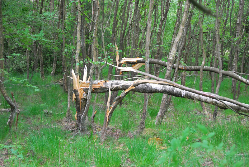 a big storm blew through late yesterday afternoon. high winds and driving rain accompanied it. there were branches down on the road here and there and we decided to check our forest today. to our surprise, there was a wide swath of downed trees. i tried to count, but stopped at 35. there are probably at least 50 and it's a clear path, like a tornado went through, even tho' otherwise conditions weren't as we know them for tornadoes in the midwest of the US (instead of hot and humid, it was rather chilly and no lightning and thunder seemed to accompany the storm).