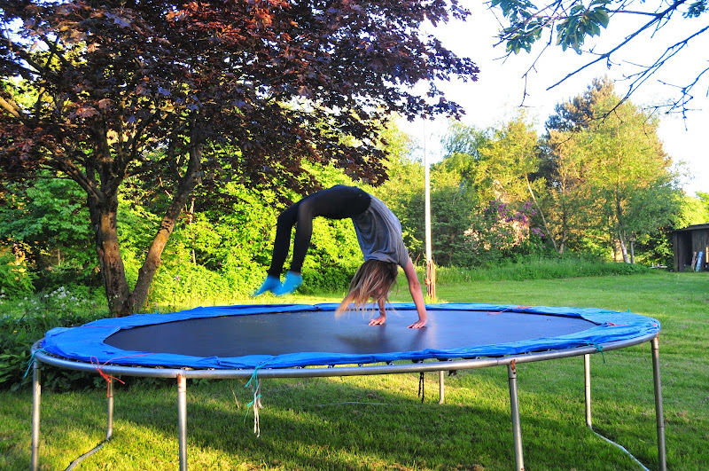 long, golden evenings stretch out in the garden. the child is constantly in motion and never far from her trampoline for long. she's trying to perfect handstands before her grandmother gets here.