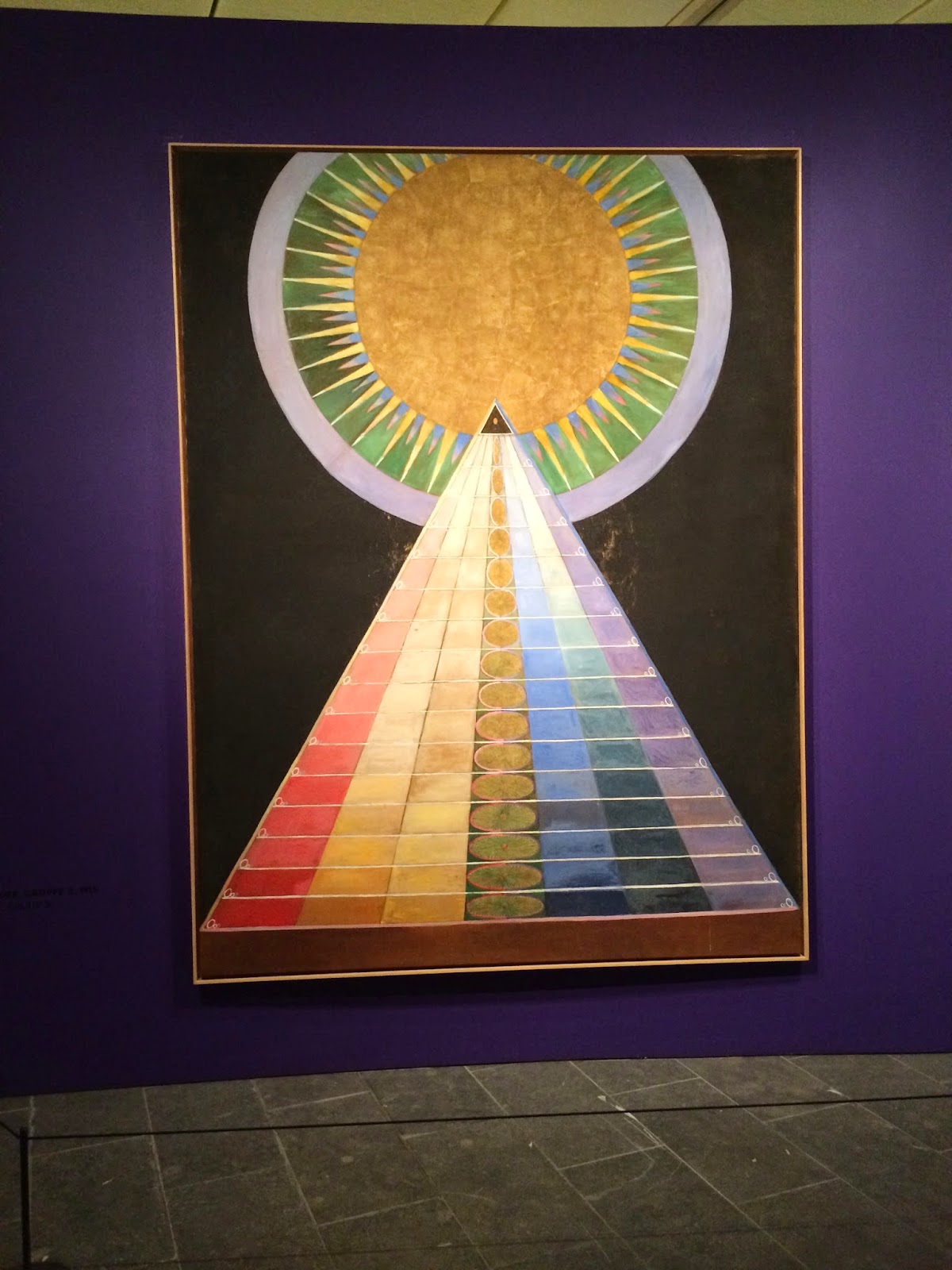 there are ten works in this series, these were just my favorites. they represent the phases of life, from infancy to old age. they are enormous and dominant works. they were painted on paper using hand-mixed tempera paints. they had been rolled for years in an attic (luckily dry), since hilma af klint's will specified that the works could not be shown for 20 years after her death. she believed she was painting the connection between the physical and inner worlds we inhabit. she believed the pictures came to her from a higher consciousness, which conveyed its message through her. she created a whole symbolic language with which to convey these messages. it has yet to be fully decoded, despite her leaving behind extensive journals, documentation and notes. scholars are only beginning to give her work the attention it so richly deserves.