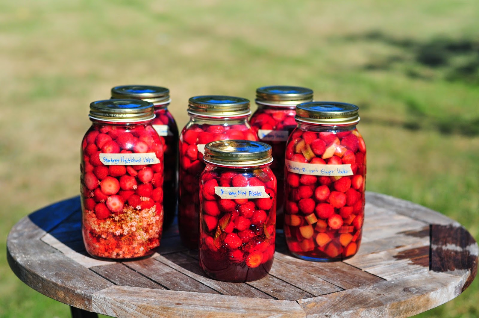 five and a half hours of picking berries and another four hulling and preparing them over two days resulted in 9 (tho' only 7 are pictured) bottles of cordial, in addition to the vodka and shrubs above. it's a gorgeous, deep red color and is going to make for awesome cocktails.