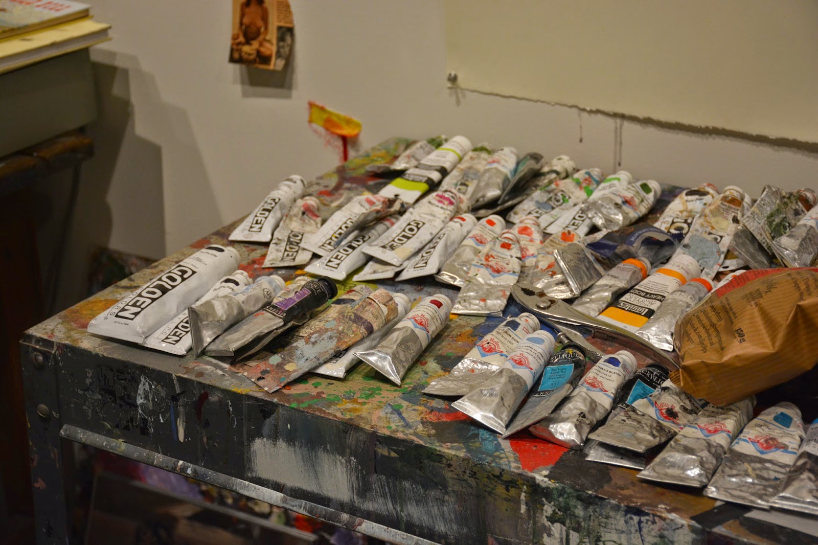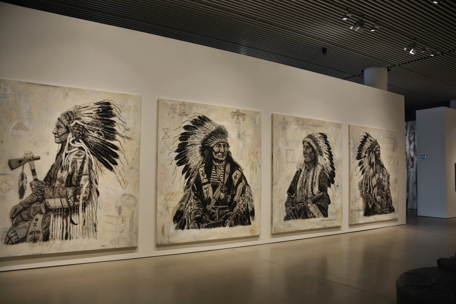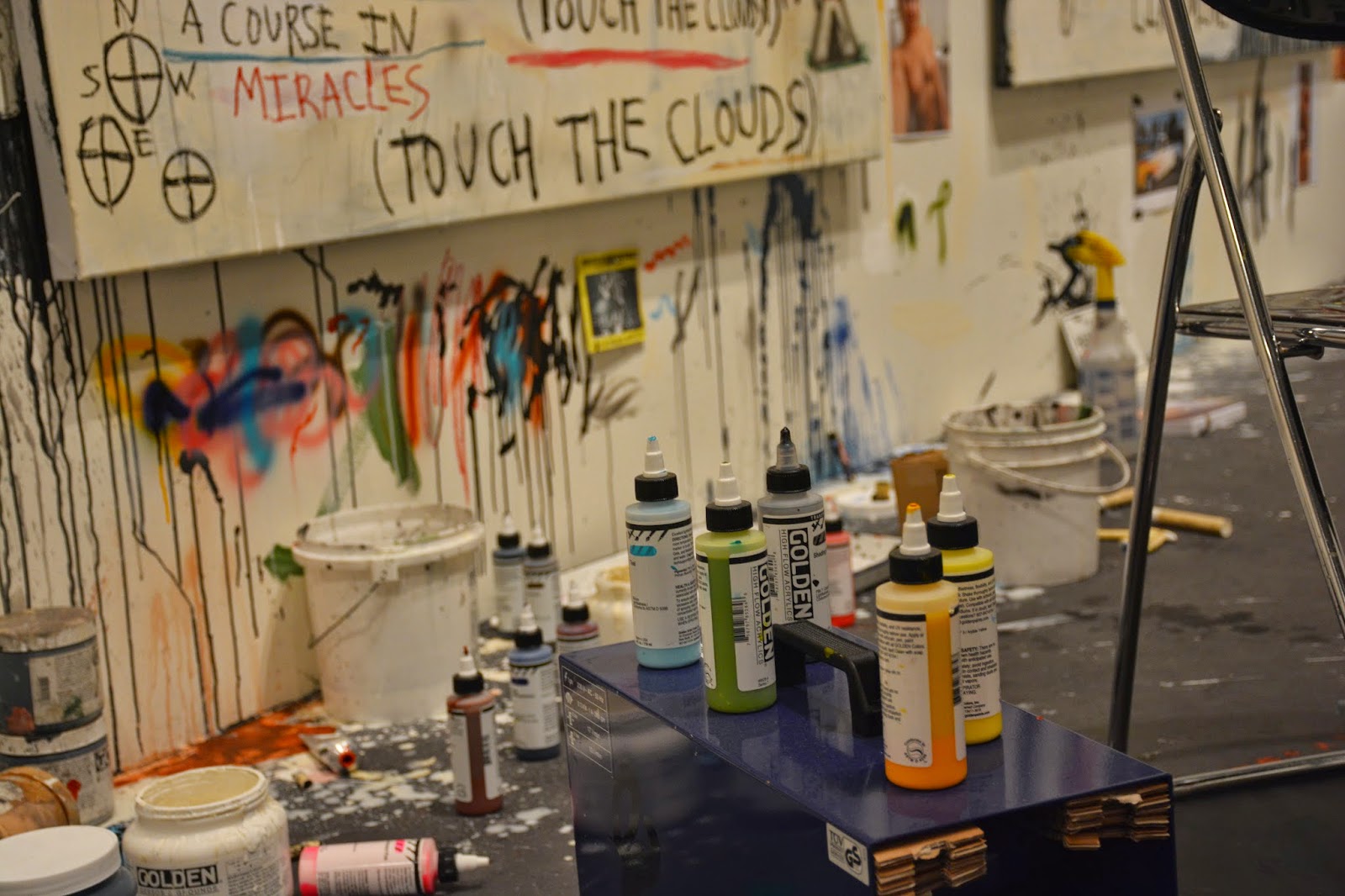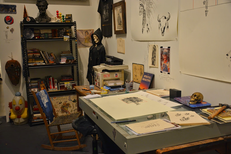 his art retains that tattoo feel and is infused with various american icons...native americans, motorcycles, flags, skulls (not that skulls are uniquely american). the exhibition was an ambitious rendering of his studio, so there were paints littered here and there on the floor and many large canvases that were works in progress. with him there, it definitely lent the feel of really being in lang's studio.