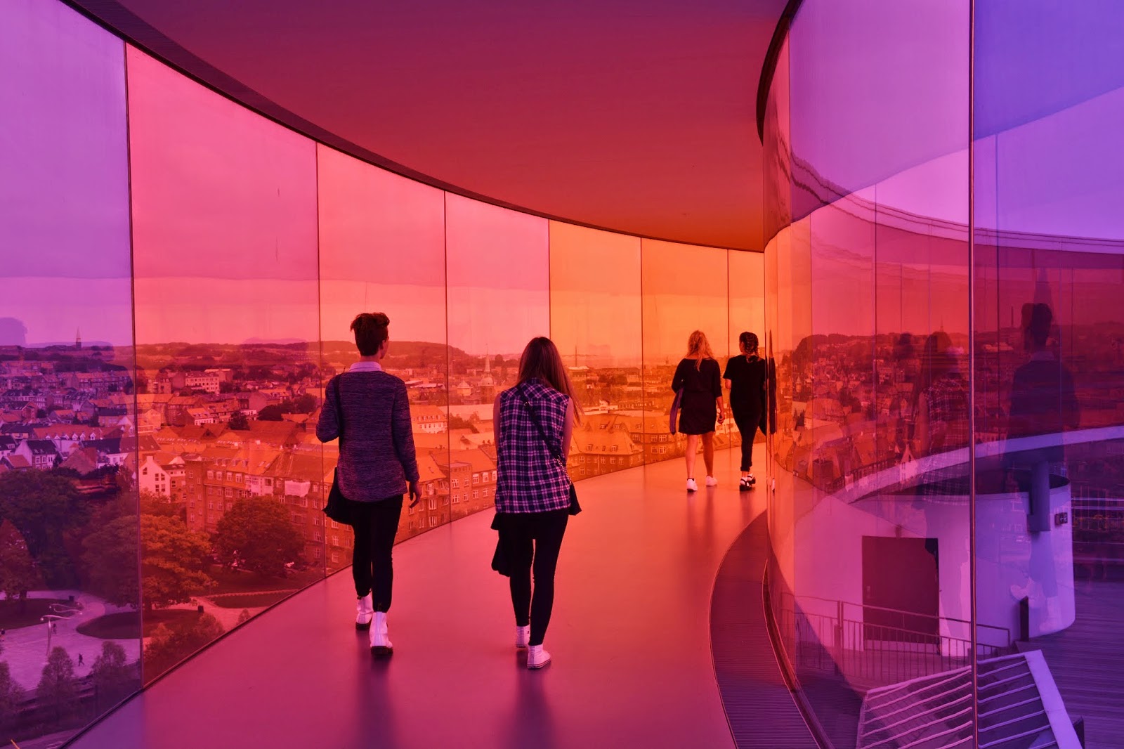 surely the best part of ARoS is olafur eliasson's rainbow panorama on the roof - you look out upon the city of århus through literally (in some spots) rose-colored glasses.