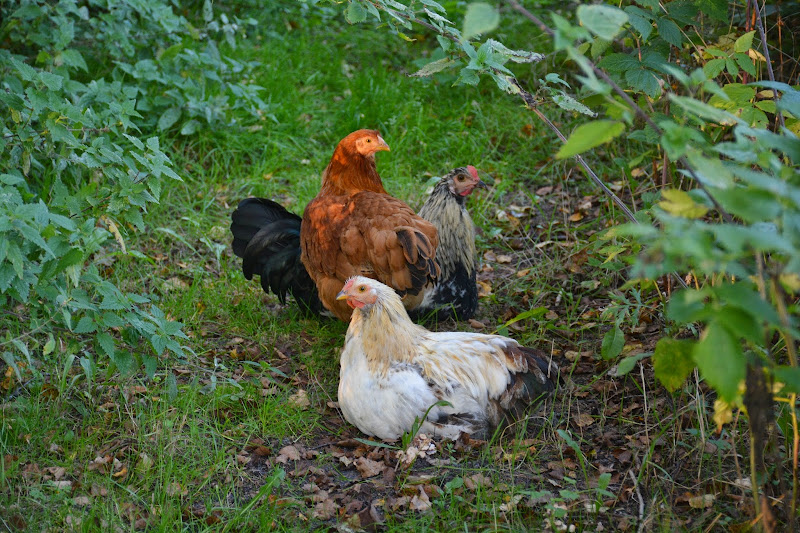 we have chicken weirdness at our house. ever since the fox came into our henhouse earlier in the summer, all of the remaining chickens really don't like to be in there. i had these three locked in for several weeks (there is a fenced-in outdoor area as well) and this week we got a new hen with ten half-grown chicks. then, after a day or so, i found three of the chicks pecked to death and i opened the door so everyone could go out, thinking they felt too cramped. and also thinking they would come back in at night. they did not. and they're all back up in the trees at night. we have feral chickens at our house. and husband is talking about tearing down the henhouse and starting over.