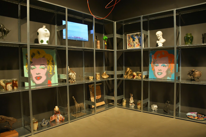 out of the darkness played with the notions of traditional ways of exhibiting art, even while it also engaged them by having a strict entrance and exit and only one way through, forcing you to follow a particular, pre-determined path. at one point, you come to a room that seems a bit like a warehouse for storing art, but instead it was exhibition space, featuring multiple andy warhols and bjørn nørgaard's jars of chopped up horse, among many other pieces, rather casually displayed and labeled with a dyno labler. (this may be one of the spaces that struck me as trying too hard.)