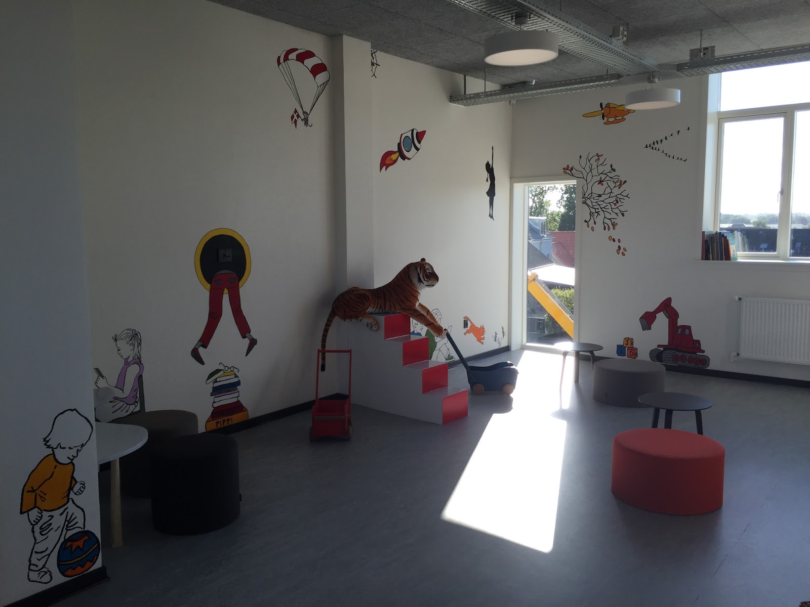 yesterday, we wrapped up a group project, decorating the wall in our new library's minibib - the library for the littlest kids (age 0-6). seven of us in total worked on the project over the month of september. the brief was to take inspiration in the children's books illustrated by swedish illustrator helena davidsson neppelberg. her simple style, filled with bright colors and flat illustrations with no shadows or contours is perfect for a children's library. but, we also decided that we wanted it to feel very contemporary, so the figures would have a street art quality - where although we didn't use templates, we wanted them to look like they were done from templates and if there was color, it would be one single color or at most two. we wanted whimsy and without violating any copyrights, to create imagery that the children would recognize. i think, in the end, we achieved this, but it was an interesting process.
