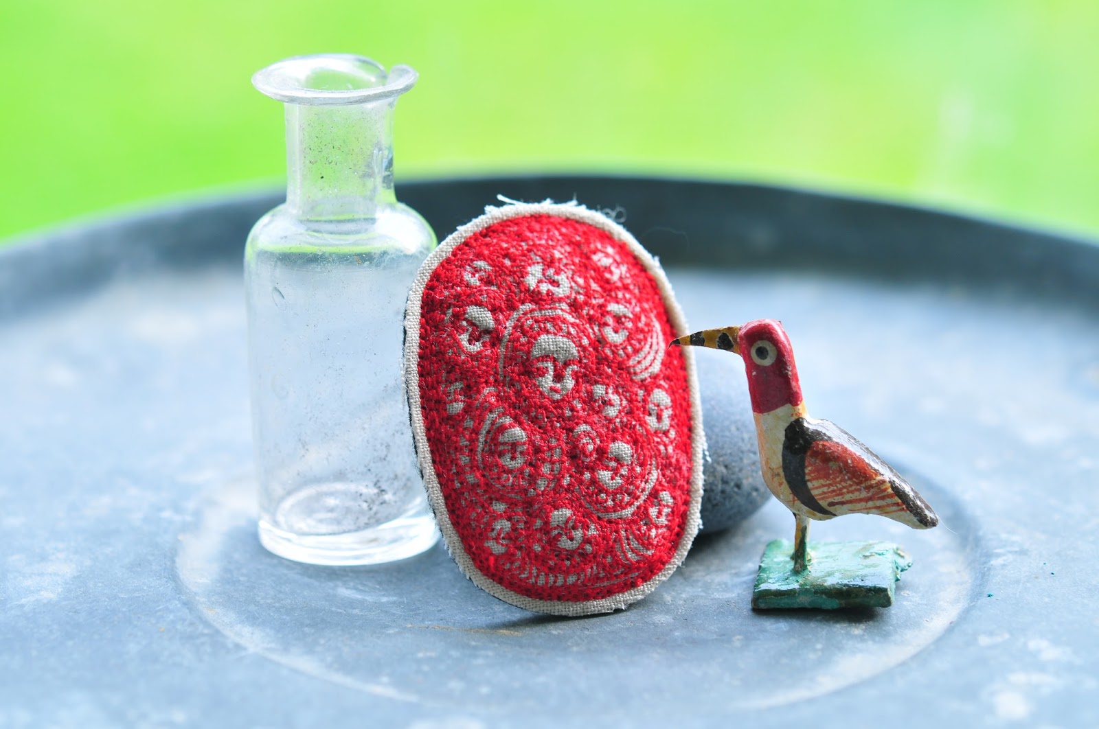 a new one of cathy cullis' beautiful brooches - these faces speak to me of all the voices in our heads. they do it in a good way, sort of embracing the madness and making it beautiful and wrapping it all into a coherent whole. i'm in a navy blue period clothing-wise (i think everything has to match my glasses), so a little splash of red is welcome.