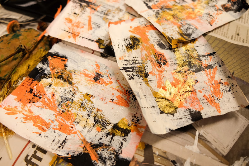 so much fun. we each chose a color palette and after a walk, to gather bits and bobs from nature, we settled in to work. we used a variety of techniques - painting with acrylics, using gel pens, printing with feathers and plants, slowly building up texture on our pieces.