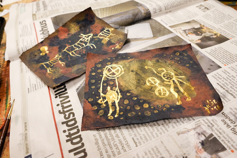 i was surprised by the direction some of my pieces took - these two got rather dark after i became inspired to use a bit of dusty grey pastels on them, giving them a very different look than my other, bright pieces (underneath, the palette is the same). and some of my old favorite helleristning motifs came out from somewhere in my subconscious. it felt right, like moments of flow always do.