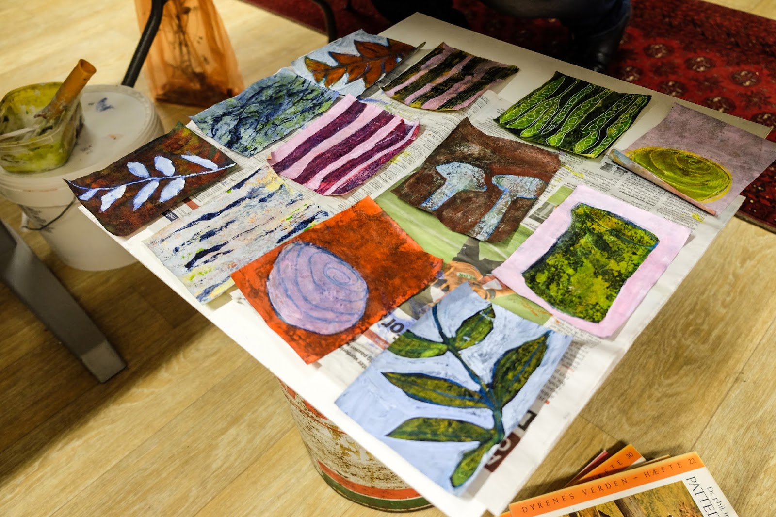 i had a little weekend getaway with a few friends. one of them has moved over to fyn (the island between us here on the "mainland" and the big island where they keep copenhagen) to an idyllic little village and opened a gallery and B&B. so charming! and she's got a beautiful studio, where she showed us how to do the monoprint technique she's been working with of late. we used "china paper" - a thin, but surprisingly strong paper that can take a lot of layers of paint and texture.