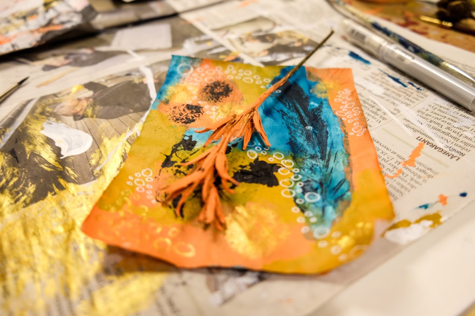 so much fun. we each chose a color palette and after a walk, to gather bits and bobs from nature, we settled in to work. we used a variety of techniques - painting with acrylics, using gel pens, printing with feathers and plants, slowly building up texture on our pieces.