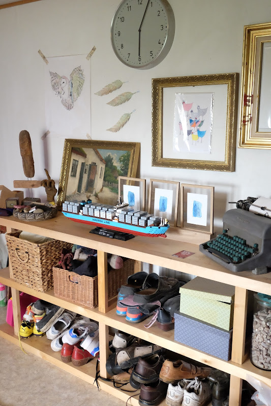 it's been raining all weekend, so i've been stuck inside, on a mission to tidy up and clean. i hadn't done more than the very bare minimum since my back troubles began back in october. but today, all the rugs were taken out (between showers) and shaken. cobwebs vacuumed up, shelves dusted with a damp, soapy cloth and a bit of rearranging of beloved items. the entryway is still where we stack our shoes and hang our coats, but it's much more inviting.