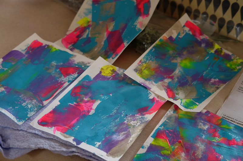 then i spent the afternoon being creative. we've started a thing in our local creative group called "CreaGiving" - where we teach one another a technique. today, we learned to make small abstractions using print techniques and an old hotel room card. i also used a small acorn cap as a circle stamp. in the end, we mounted the best ones on cards. i didn't mount any of my bright ones, as i want to work further on them. but i made some pink and yellow ones that i was happy enough to turn into cards.