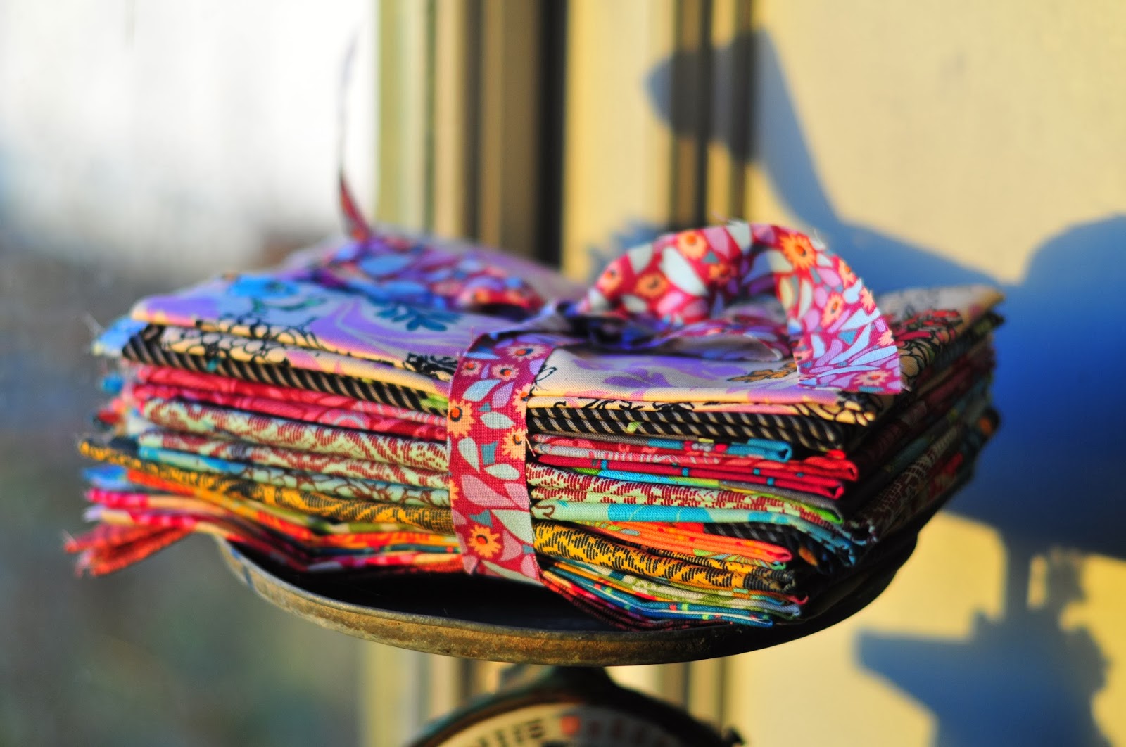 we saw the sunshine today for the first time in several weeks. it was most welcome. and my stack of the new anna maria horner line (which i got from my sis for christmas) looked fetching in the late afternoon sunshine.