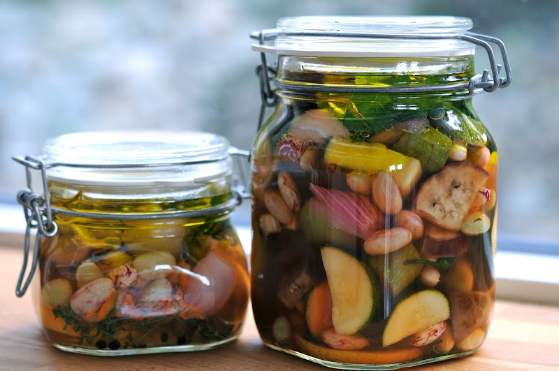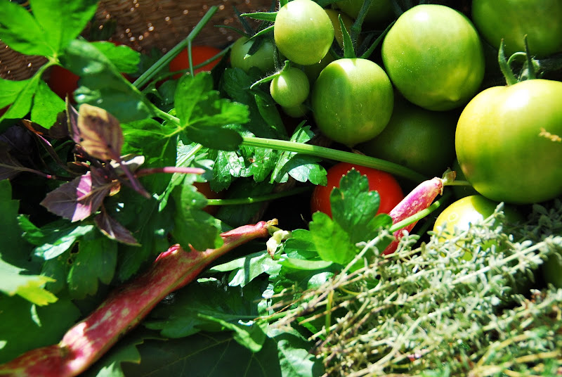 this weekend, i took the last of the season's bounties from the garden - tomatoes red and green, thyme, basil, chili peppers, zucchini, eggplant, parsley, zucchini flowers, shallots and borlotti beans and i turned them into this: