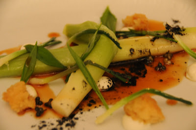 - local leeks with goat cheese, croutons and ramsløg, a wonderful wild mild garlic found this time of year. sprinkled over the top was a fanastic ash made of hay. the wine was a red from the rhine, a 2005 spätburgunder rubeus from j. koegler.