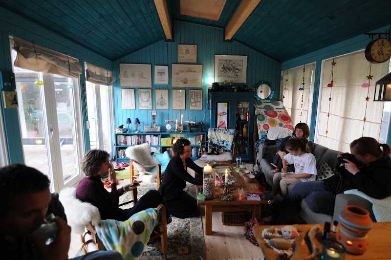 it was chilly from all the rain and husband had started a fire for us in the wood-burning stove in the blue room, so we moved out there for more wine and strawberries and cream and lots of laughter. we diffused some of the wonderful gingery-lemony "blog camp blend" of essential oils that