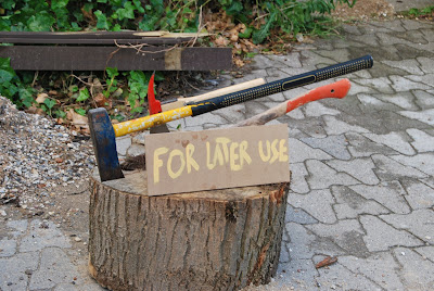 when we arrived, husband had placed this stump and all of the axes in the household out front, which was great, because it broke the tension i felt.