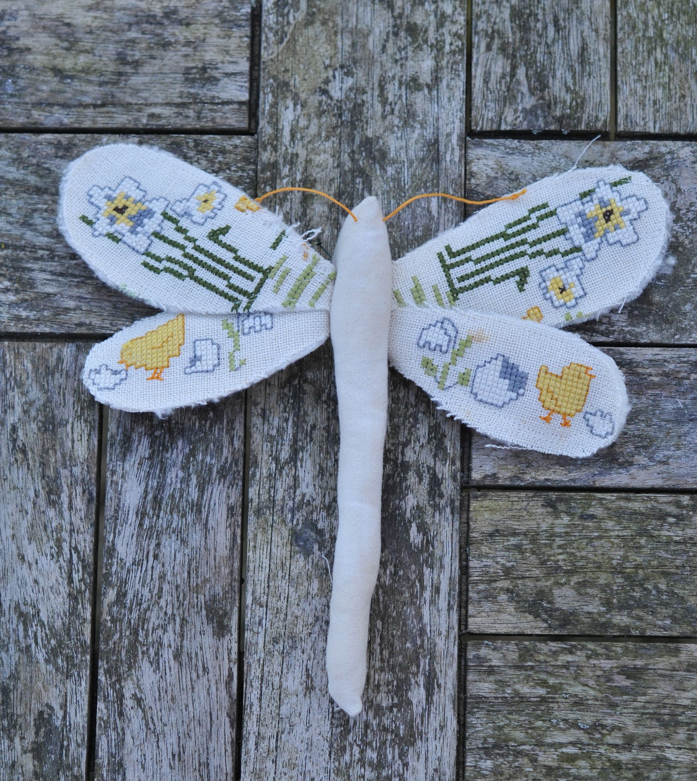 and my pinspiration no. 4 dragonfly. here's the beautiful original i was inspired by. it was hard to cut into the vintage cross stitch, but i like how it turned out, tho' it's far from the perfection of the originals by mr. finch. it's an interesting exercise to basically indulge in someone else's art. which in my view (and picasso's) is perfectly ok if you're not doing it for commercial gain. this, for me, was an exercise in forcing myself to cut into a vintage textile, as well as to find materials around me to work with...some waxed cord as feelers and some little wire legs. for the body i used a bit of cotton that was trimmed off some old curtains and had been soaked in black beans at one point. as you can tell, most of that "dye" rinsed out. it was a good exercise for me in many ways - both freeing and yet awkward. but it has pushed my thinking towards making something entirely my own.