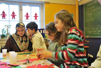 this morning it was "klip & klistre" day in sabin's class. that's the day they cut & paste and make holiday decorations and the parents and/or grandparents are invited to participate. husband and i both went along. the kids were given a couple of templates and they should make small nisse (elves, only naughtier) to hang in the windows and christmas trees which will go out in the hallway.