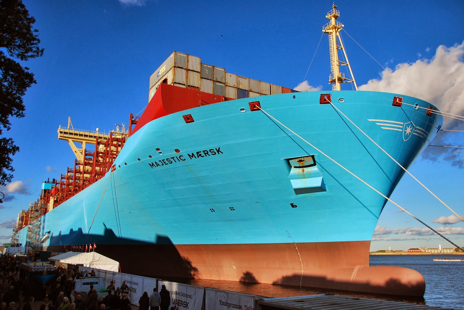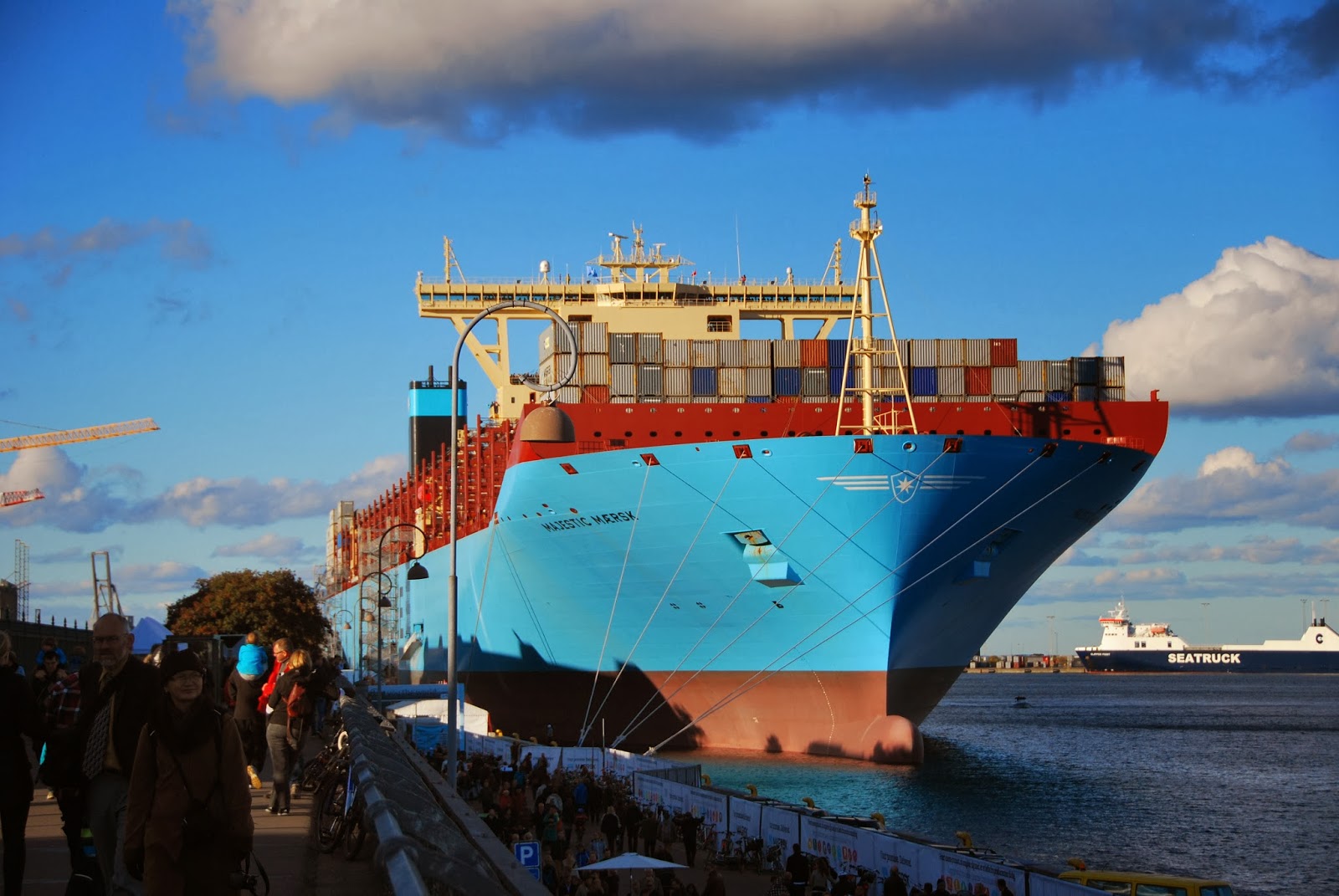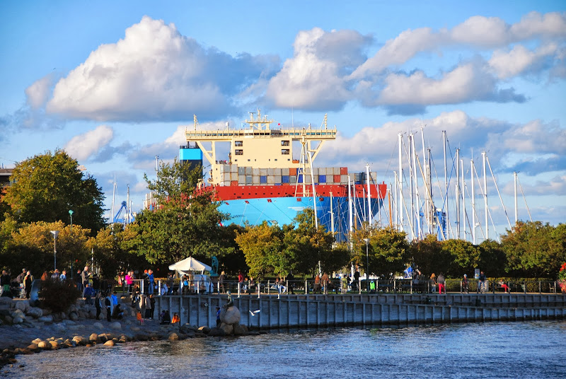 the world's largest container ship, the majestic maersk, is alongside langlinie in copenhagen these days. i don't think these pictures convey how truly enormous this ship is. 400 meters long and 59 meters wide and it can carry 18000 containers. it's good she's not closer to the little mermaid, because it would underline once and for all that the key word with her is indeed little. this is a whole new class of viking ship, don't you think?