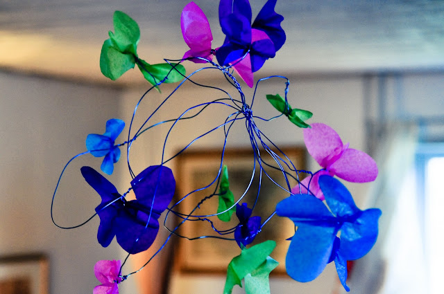 on the last night of my vacation, i went to a shibori/tie-dye dyeing session with my local creative group. i took some odds and ends of cloth. most of it from the fabric we used at sabin's confirmation in 2014, which was a bit stained by food and wine. now you can't see any of those stains. the piece on the left was a remnant of white linen. i put it in the second round of the dye bath, so it came out lighter, but still cool.