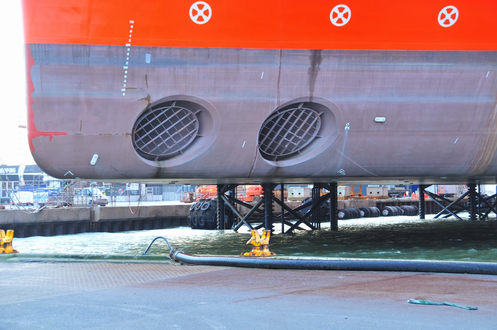 these are just the bow thrusters, which help maneuver it into place. you can see it was jacked up on its legs there in the harbor.