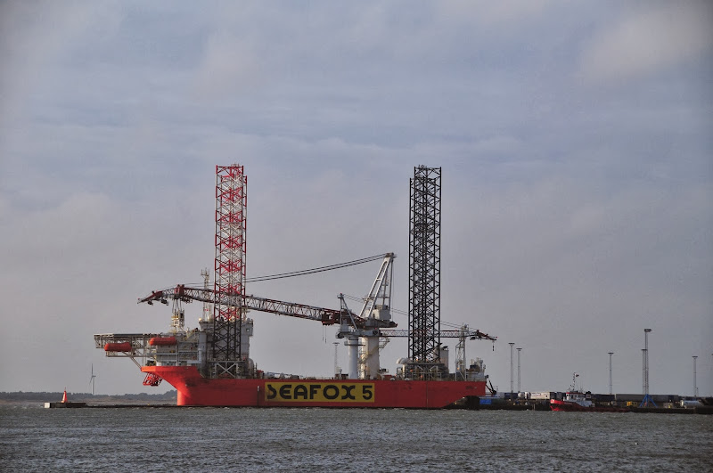 esbjerg is the port to the danish sector of the north sea. there are oil platforms out there on the horizon and quite a lot of offshore wind farms going up, so there are some exciting vessels in the harbor on a regular basis. like the sea fox 5, a wind installation vessel. and a floating hotel for all those wind farm workers to stay in.