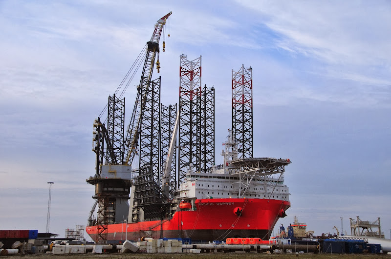 but my favorite one in port on monday was the pacific osprey. it's a huge wind installation vessel owned by swire. it was built at samsung heavy industries in korea (i've been there!), but finished and named in denmark (which sounds a little unusual). i have to admit that seeing such a ship makes my heart beat a little faster.