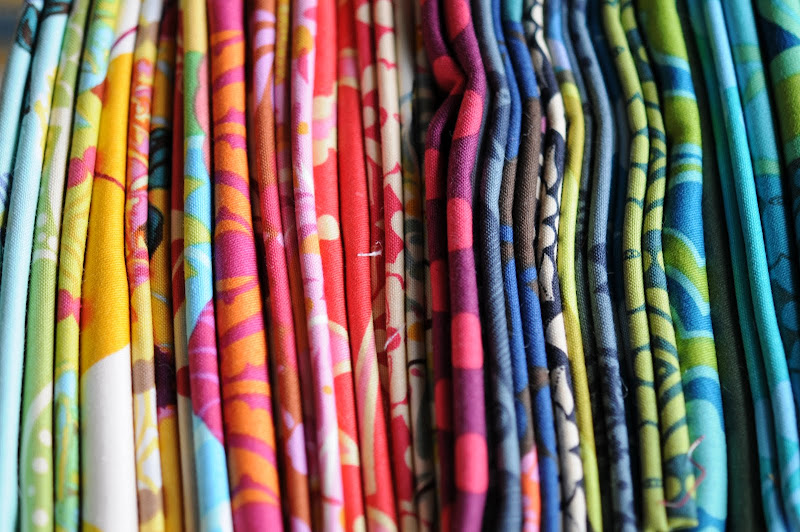 being surrounded by beautiful fabric makes me happy. i can sense a nearly audible hum in the air...the hum of potential. and at times, i swear the fabrics whisper to me and tell me what i should make of them. so it would be crazy not to have plenty of their little voices at hand. right? right? ok, i do realize this makes me sound like some kind of crazy lady, but still, the stash makes me happy. and it begins to be evident that happiness is what's at the heart of all of this collecting.