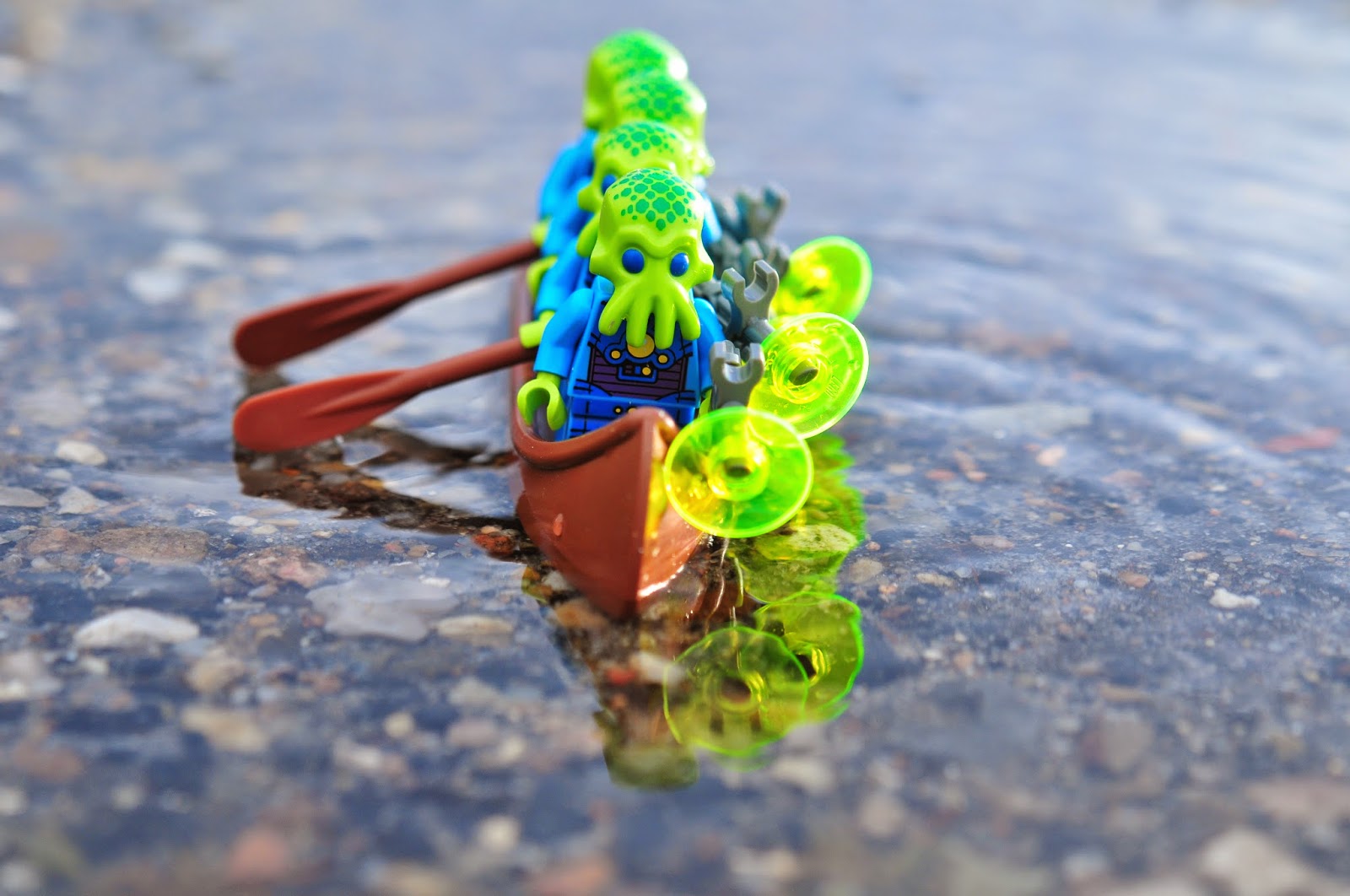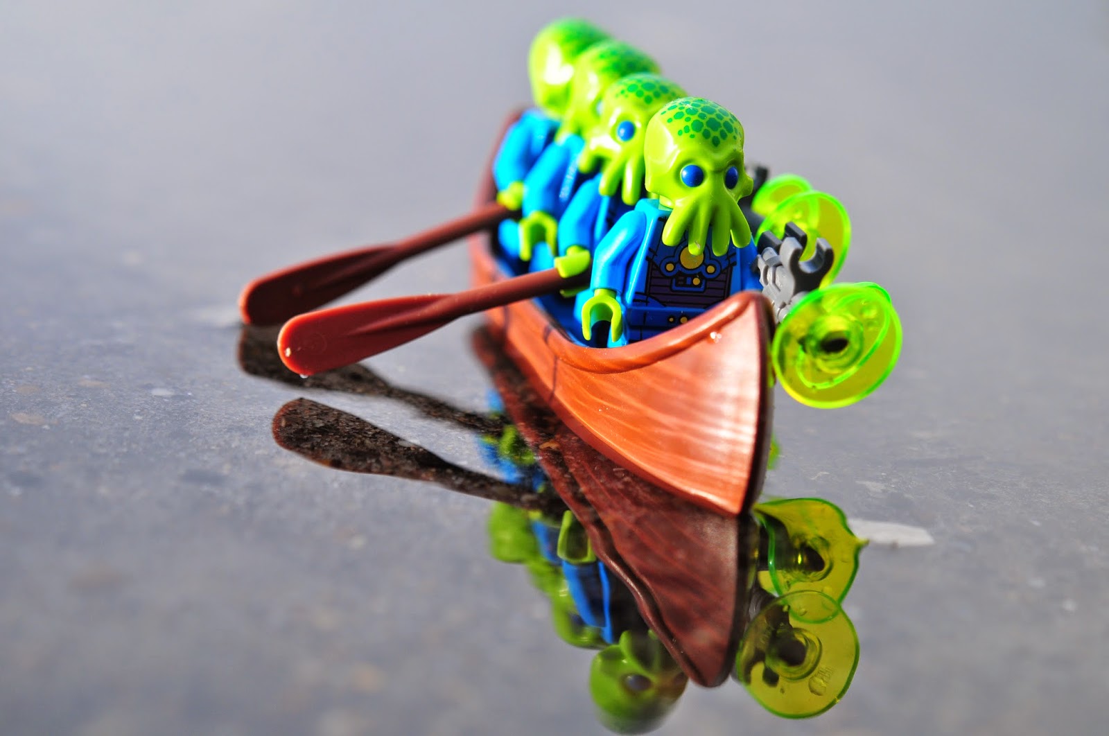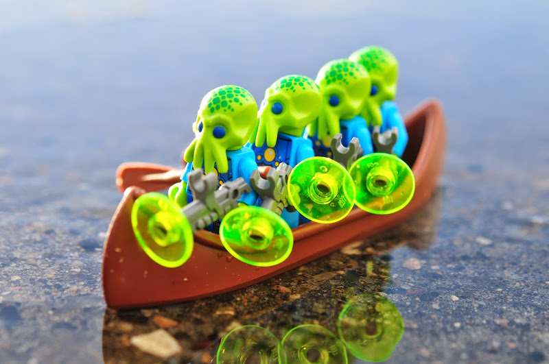 the alien trooper from series 13 seems to have replicated himself around here. i was rather disappointed at first (i'd much rather have multiple unicorns), but then i decided that a whole group of them could easily take the canoe out for a spin, like they're a rowing team. our weather has been absolutely horrible this weekend - rain, sleet and hurricane force gales, even as far inland as we are. but for a few glorious minutes late in the afternoon, the sun came out and the aliens went for a little row.